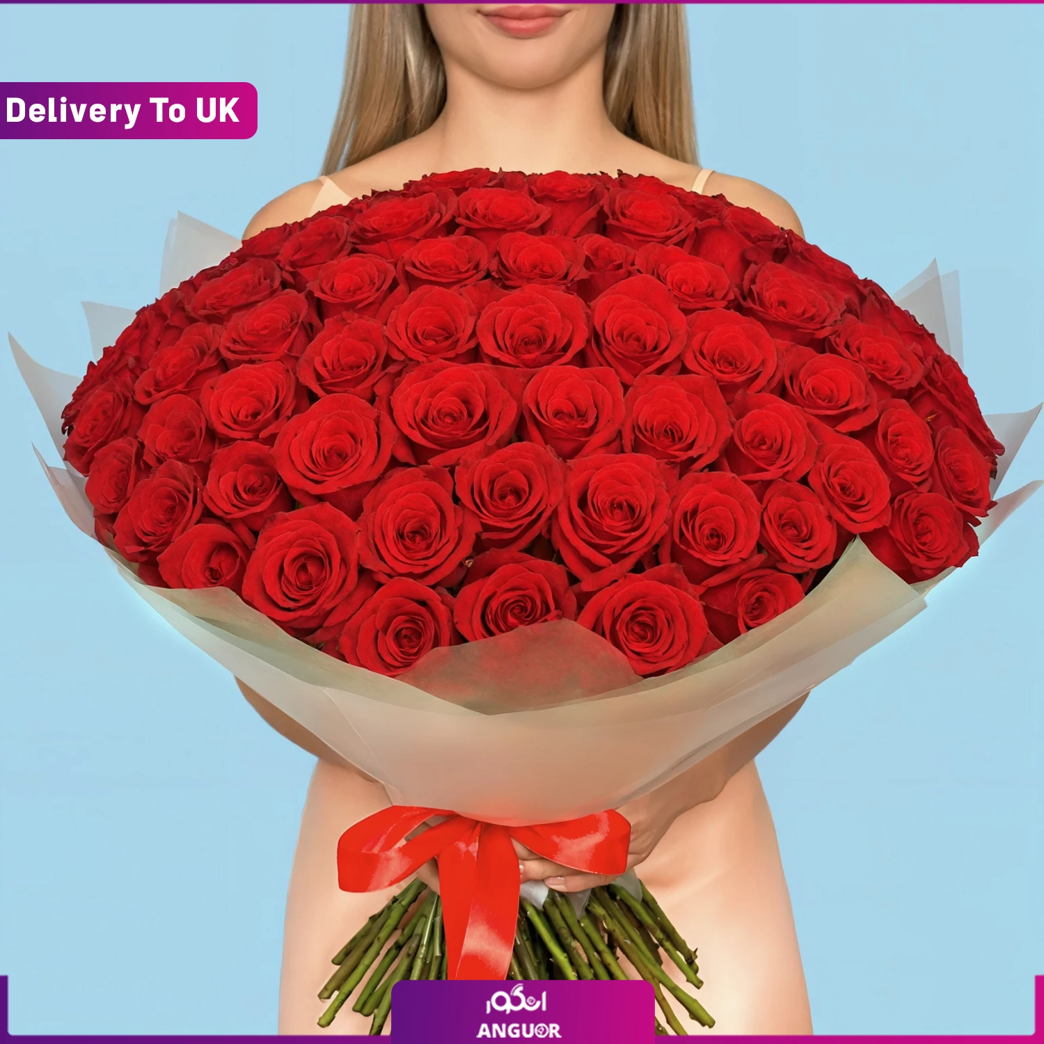 دسته گل 100 شاخه رز قرمز لوکس (تحویل در انگلستان)
