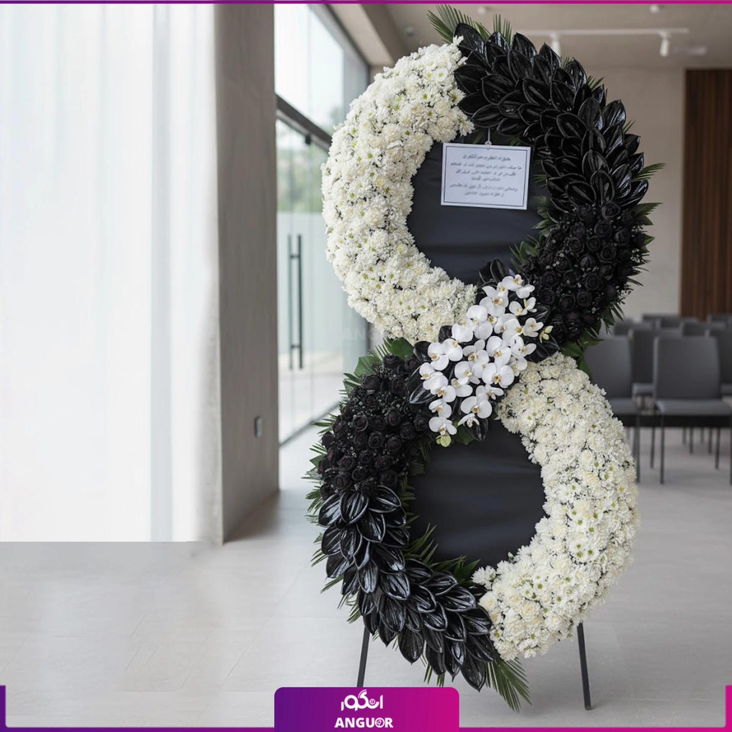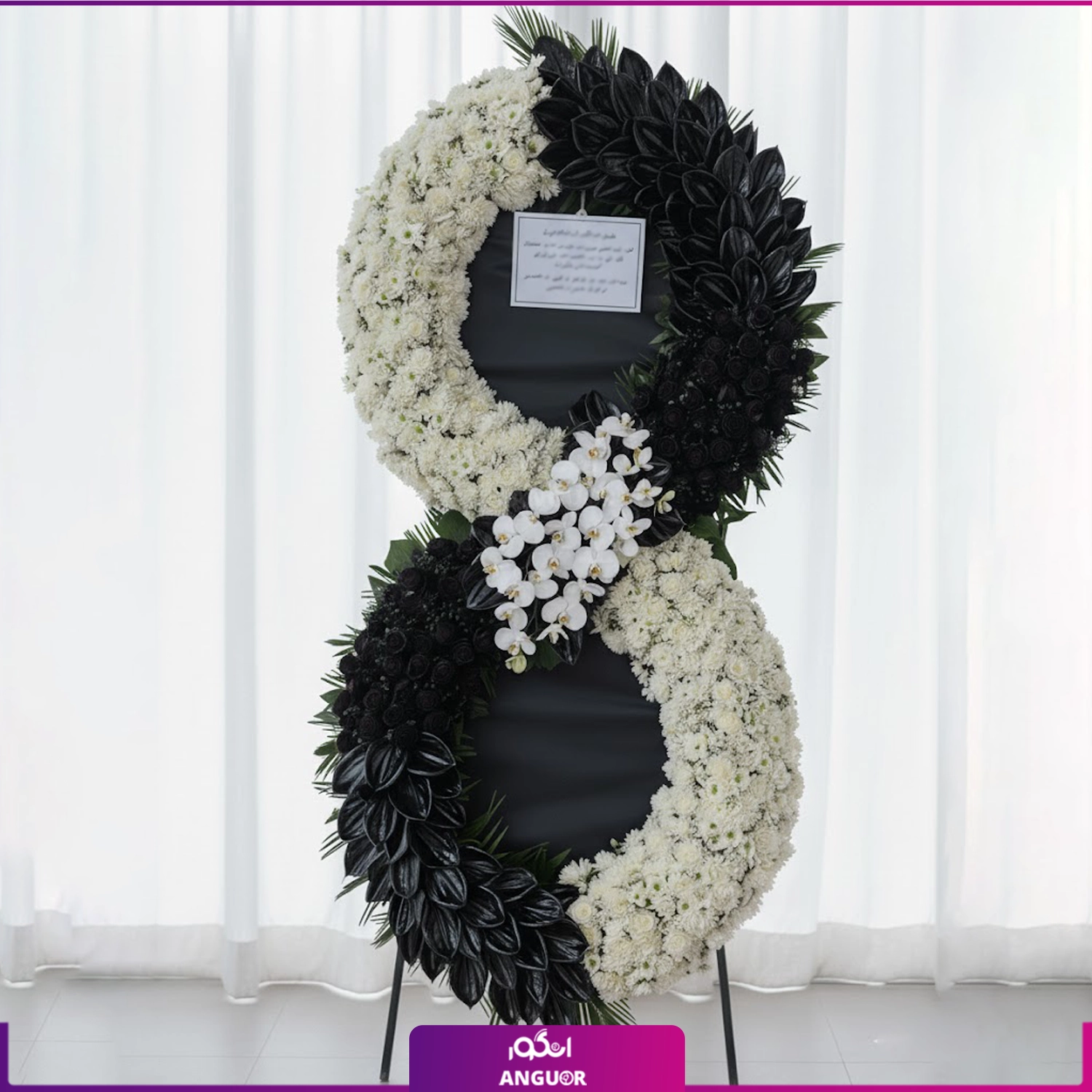 این تاج گل لوکس با تم سیاه و سفید، بیانیهی خاصی از احترام و همدردی عمیق شما خواهد بود.