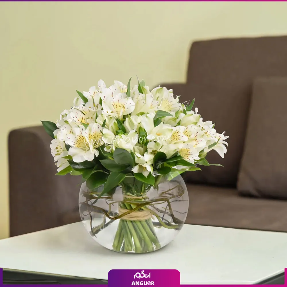 دسته گل آلسترومریا با گلدان شیشهای، تلفیقی از ظرافت، طراوت و سادگی چشمنواز است. گلهای آلسترومریا با سفید احساس شادابی و عشق را به فضا میبخشند.