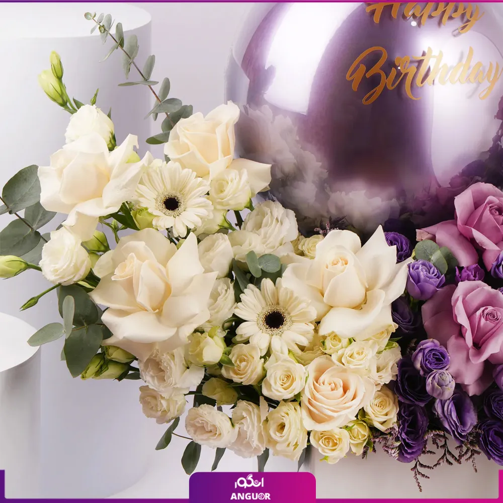 ما در این باکس، ترکیبی هنرمندانه از گل آرایی مدرن را به کار بردهایم. رزهای بنفش و سفید با رایحهای دلانگیز، گلهای لیسیانتوس با شکوفههای لطیف و گلهای عروس با ظاهری مینیاتوری، همگی در کنار هم هارمونی بینظیری خلق کردهاند. این باکس گل تولد، با یک بادکنک هلیومی براق و جذاب که عبارت “Happy Birthday” روی آن نقش بسته، کامل میشود. در پایین باکس نیز، کشویی مخفی برای قرار دادن شکلاتهای خوشمزه تعبیه شده که به این هدیه جذابیت بیشتری میبخشد. این باکسها برای انواع مناسبتها و سلیقهها طراحی شدهاند. برای مشاهده دیگر گزینهها و انتخاب گل مناسب، میتوانید به صفحه باکس گل مراجعه کنید. این بخش شامل طیف وسیعی از طرحها برای مناسبتهای مختلف است.