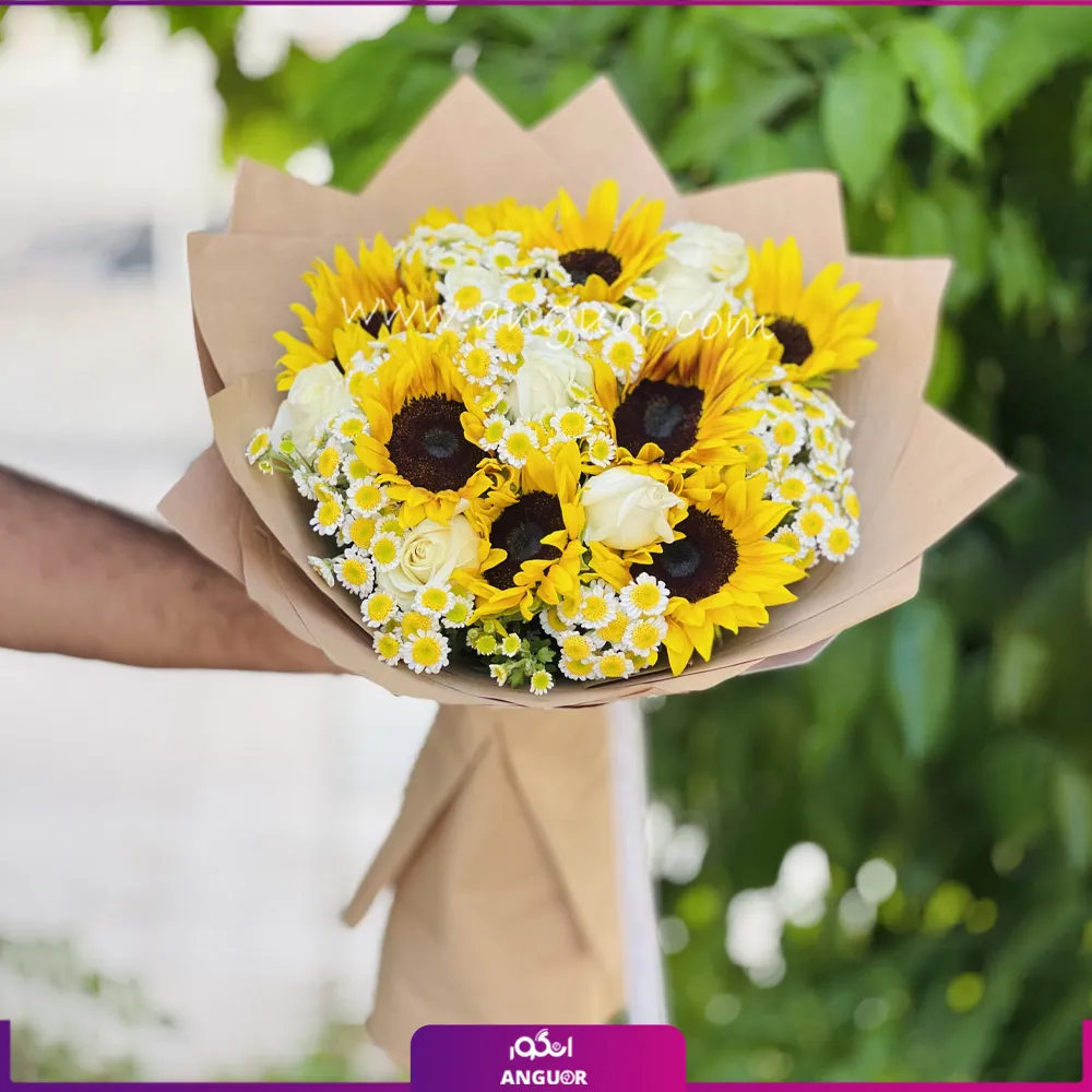 دسته گل آفتابگردان و رز سفید