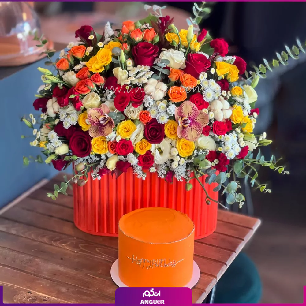 سفارش باکس گل و کیک جشن رنگها از گل فروشی آنلاین انگور