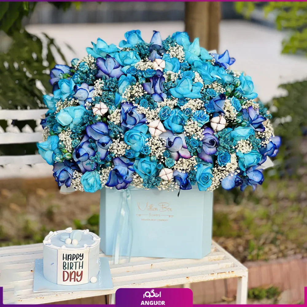 باکس گل و کیک با تم آبی، هدیهای خاص و متفاوت برای سورپرایز کردن عزیزانتان است. ترکیب ظرافت و زیبایی رزهای آبی با طعمی شیرین و دلچسب از کیک، لحظاتی ناب و بهیادماندنی را خلق میکند.