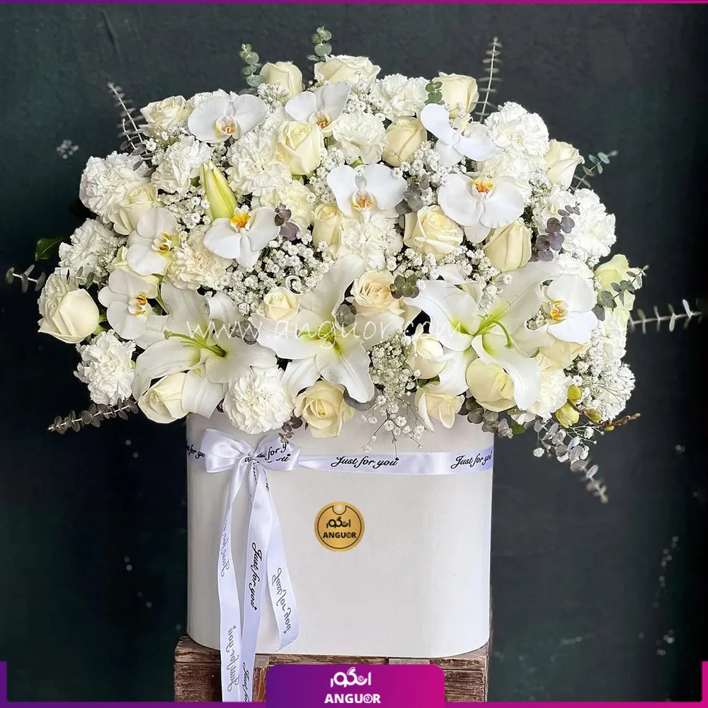 گل ارکیده با فرم خاص و شیک خود، نماد زیبایی اسرارآمیز است. لیلیوم به عنوان گل شکوه و پاکی شناخته میشود و میخک سفید نماد عشق خالص و آرزوهای نیک است. کنار هم قرار گرفتن این گلها، باکسی الهامبخش خلق کرده که مناسب مراسم رسمی، قدردانی، عیادت، تسلیت و حتی سورپرایزهای عاشقانه است.