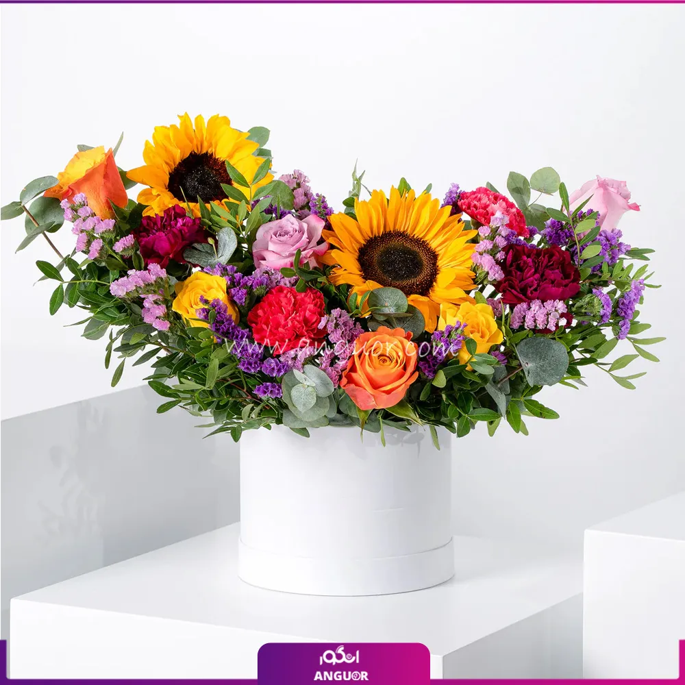 این باکس گل با استفاده از گلهای تازه و باکیفیت طراحی شده است. گلهای آفتابگردان، رز به زیبایی در یک باکس استوانهای سفید قرار گرفتهاند. مزیت اصلی این محصول، ماندگاری بیشتر گلها به دلیل وجود اسفنج مخصوص است که رطوبت مورد نیاز را فراهم میکند. علاوه بر این، حمل و نقل این باکس گل هدیه بسیار راحتتر از دسته گل است و خطر آسیب دیدن گلها کمتر است. این محصول با طراحی مدرن و شیک خود، میتواند به عنوان یک دکوری زیبا در منزل یا محل کار استفاده شود و یادبودی ماندگار از هدیه شما باشد.