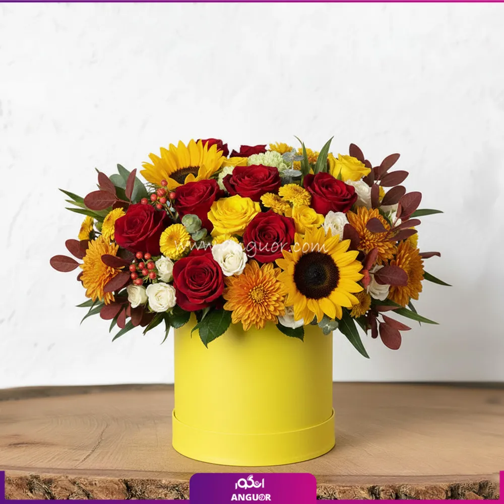 در این باکس گل لاکچری، گلهای رز قرمز نماد عشق و احساس، در کنار داوودیهای زرد و نارنجی که نشانهی شادابی و مهر هستند، با گلهای آفتابگردان درخشان آمیختهاند تا تصویری از خورشید پاییز در میان برگهای خزان بسازند.