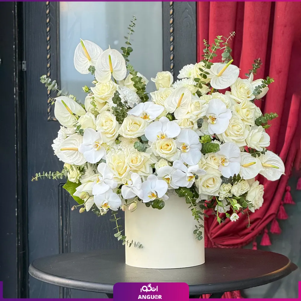 آنتوریومهای صیقلی: گلهای آنتوریوم سفید با سطح براق خود، حسی از مدرن بودن و استحکام را به ساختار باکس اضافه میکنند.