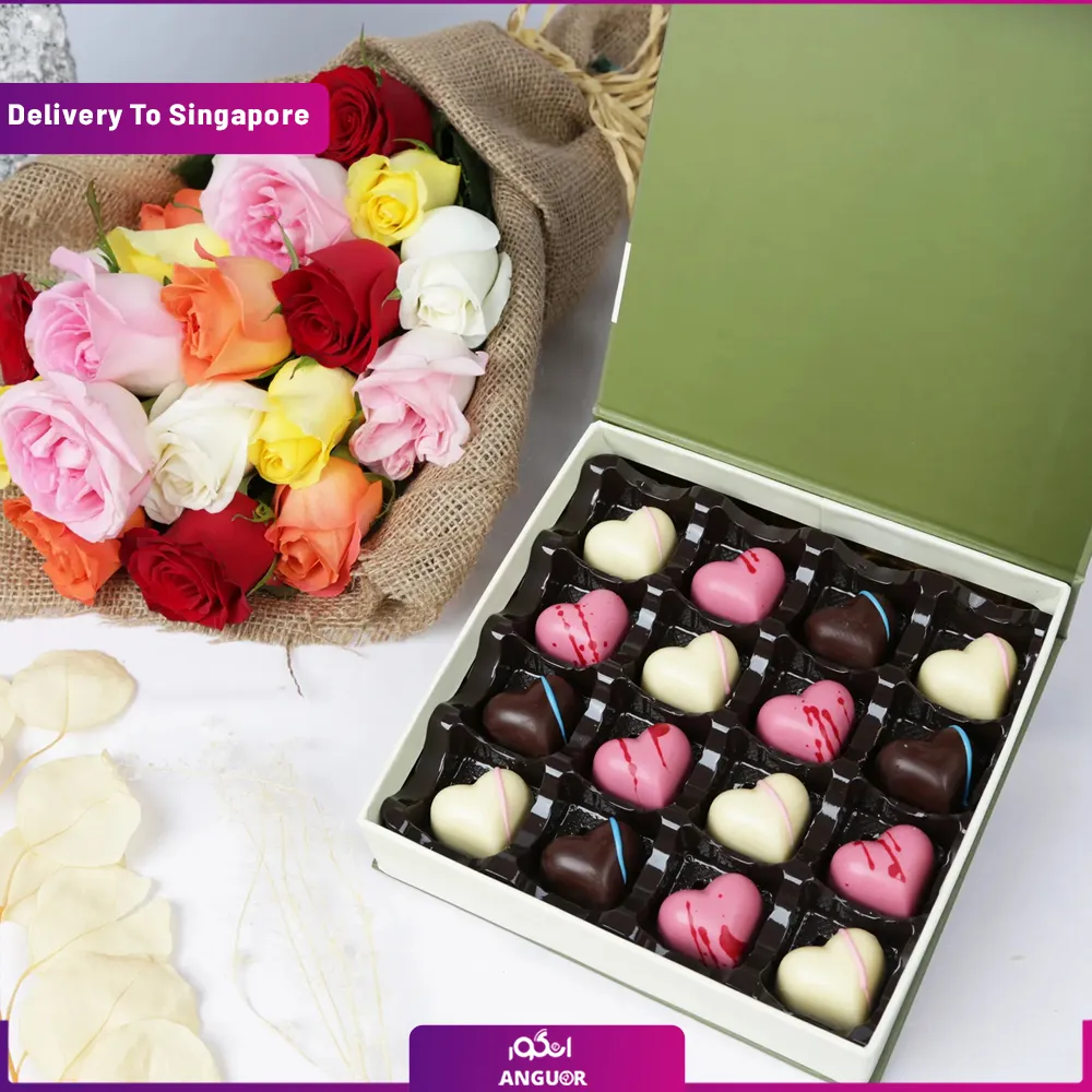 جعبه شکلات قلب با دسته گل رز مخلوط (تحویل در سنگاپور)