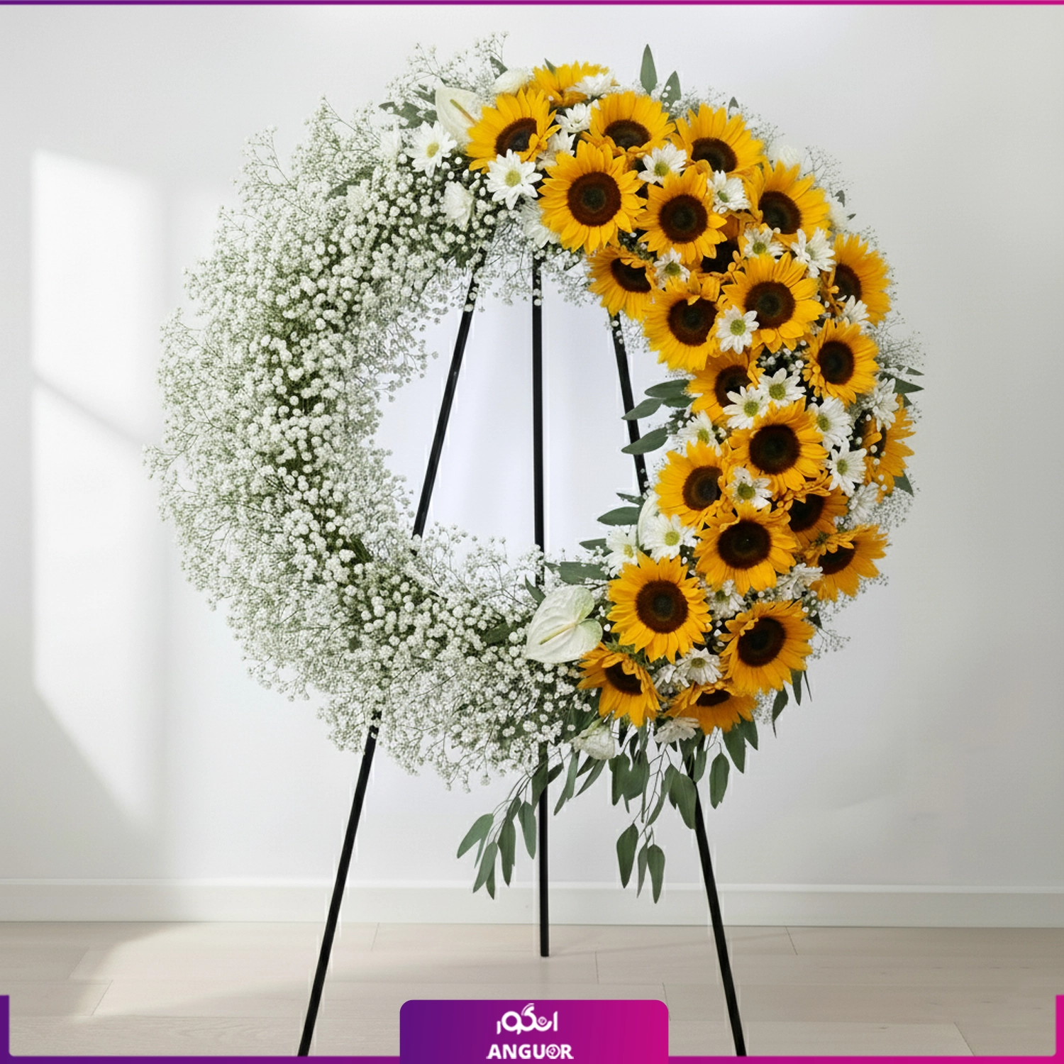 این تاج گل خاص نیمدایرهای (هلالی) با طراحی نوآورانه، یک اثر هنری خیرهکننده است. یک نیمه از تاج گل کاملاً با شکوفههای پرحجم **ژیپسوفیلا** (گل عروس) پوشیده شده که نماد خلوص، معصومیت و آرامش است، و نیمه دیگر با گلهای درشت و گرم **آفتابگردان** تزئین شده که نماد وفاداری و نور امید است. این تضاد و توازن رنگی، این تاج گل را برای ابراز همدردی یا تبریک در مراسمهای رسمی، یادبود و آغازهای جدید مناسب میسازد.