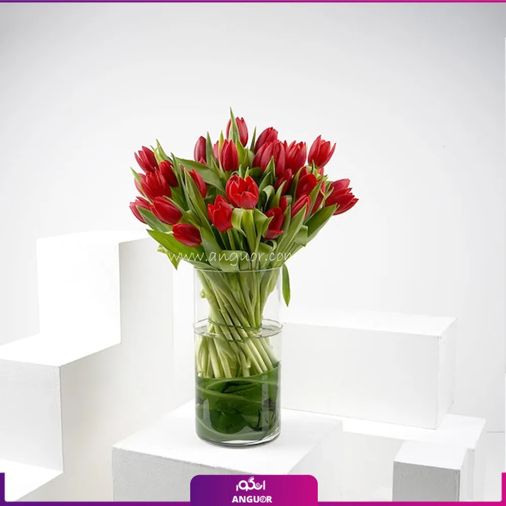 دسته گل لاله قرمز با گلدان شیشه ای (26 شاخه)