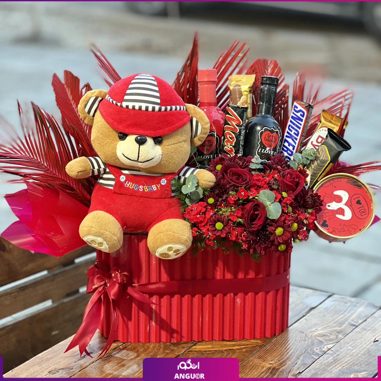 باکس ولنتاین گل و عروسک خاطره ساز (تم قرمز)