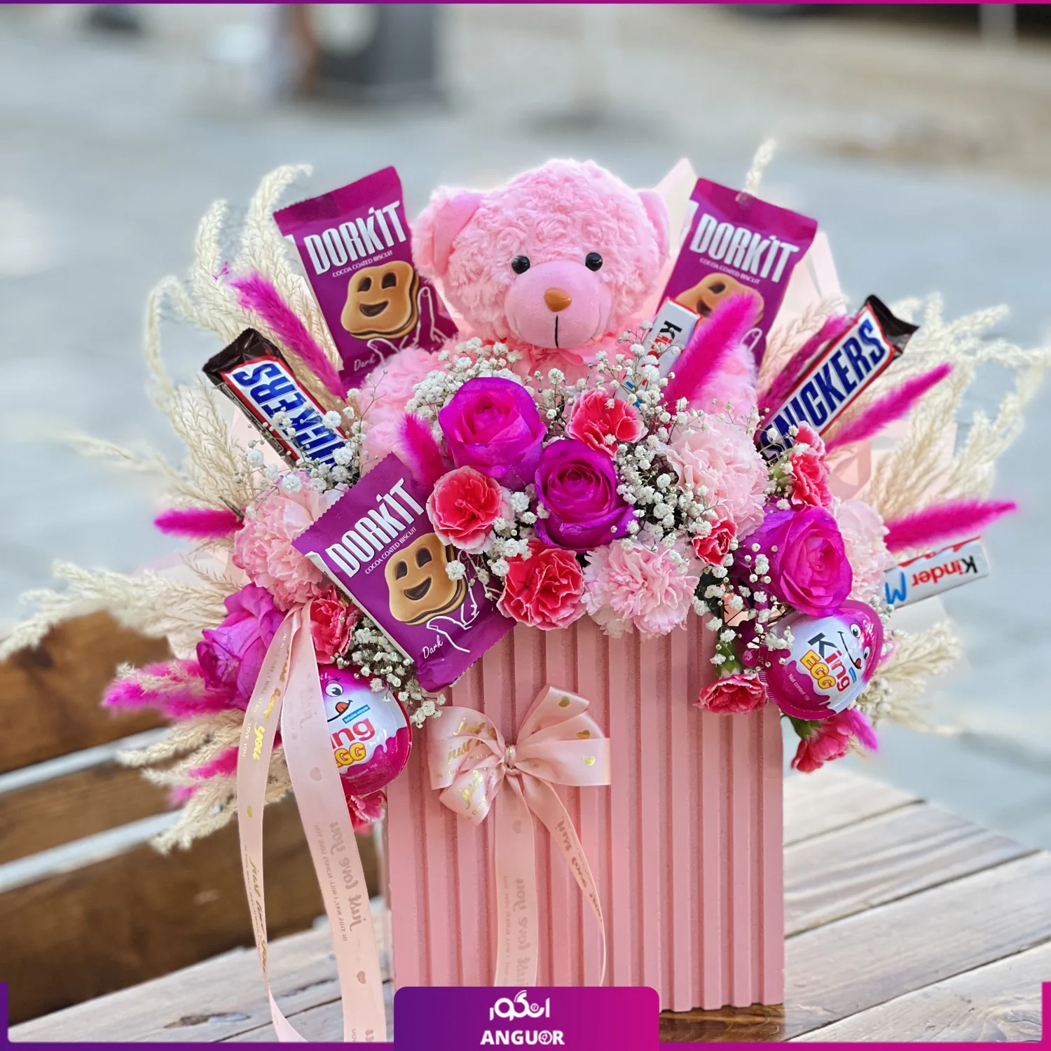 ترکیب گل، شکلات و خرس، هر سه عنصر عشق، لطافت و شیرینی را یکجا ارائه میدهد.