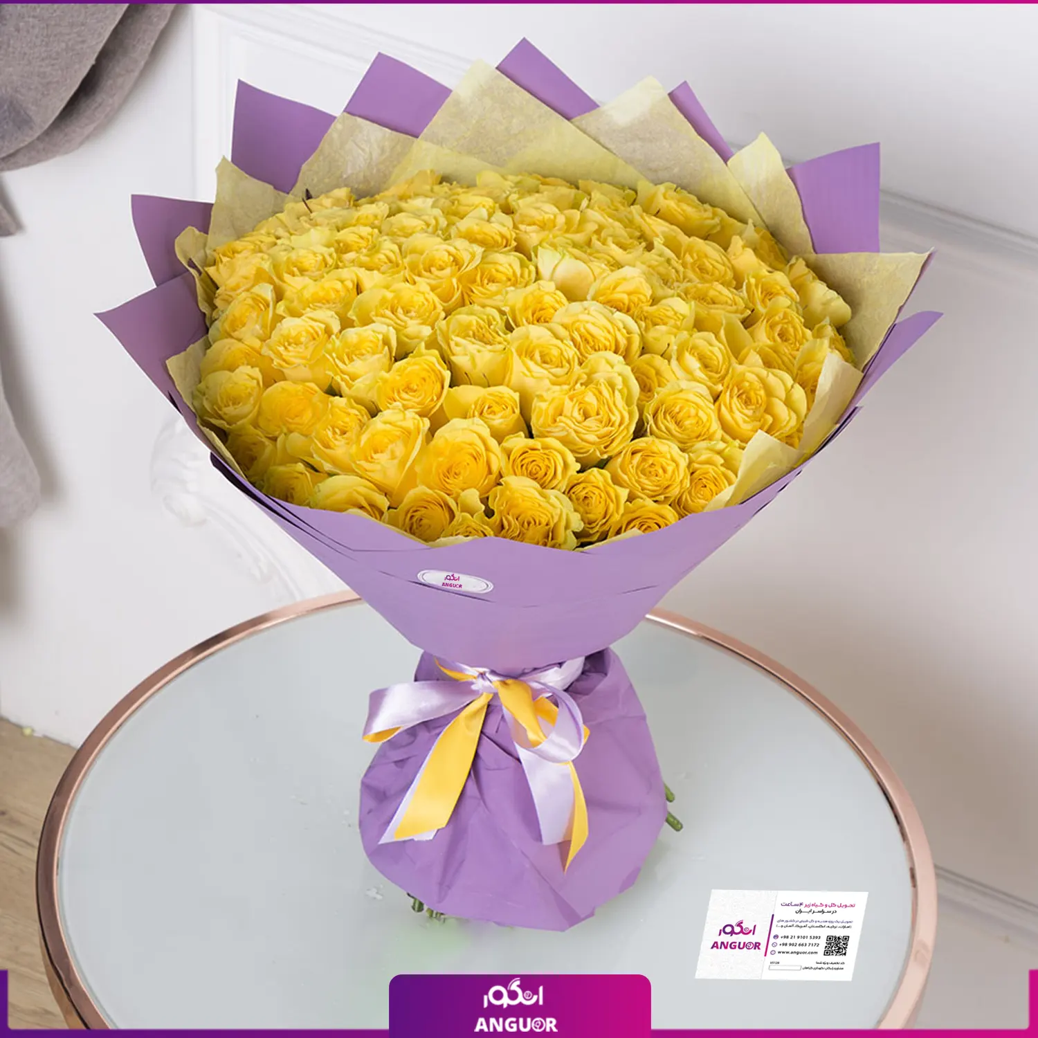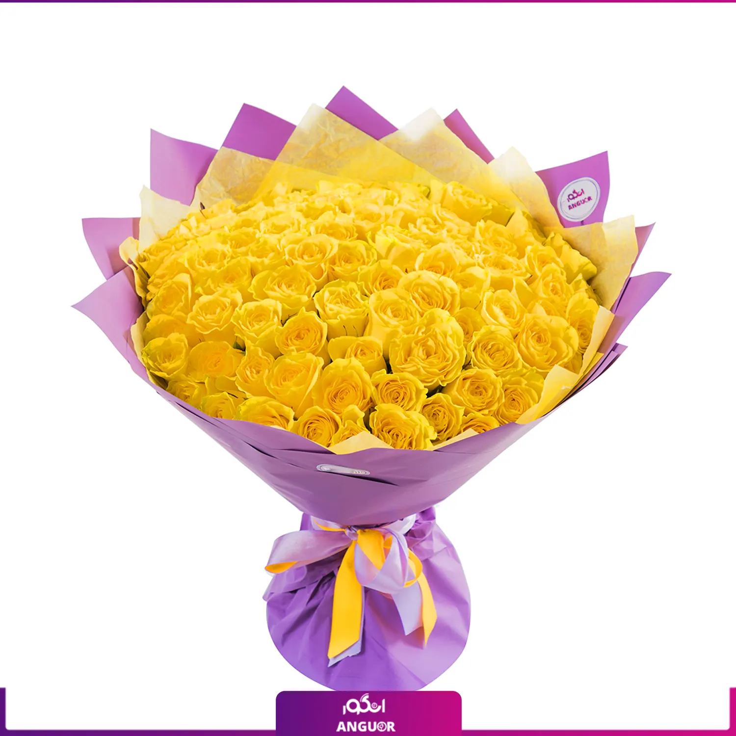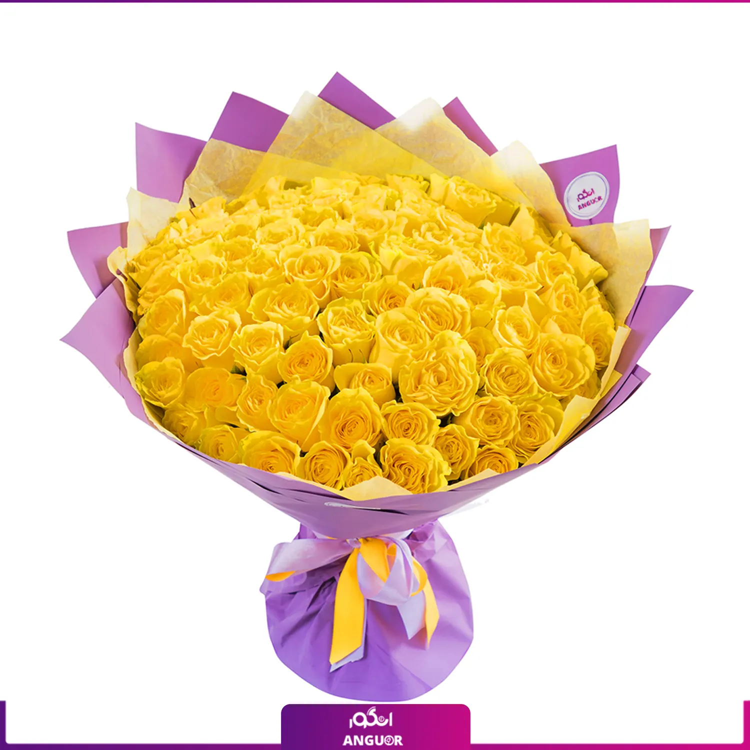 دسته گل 90 شاخه گل رز زرد 40 سانتی با کاغذ صورتی