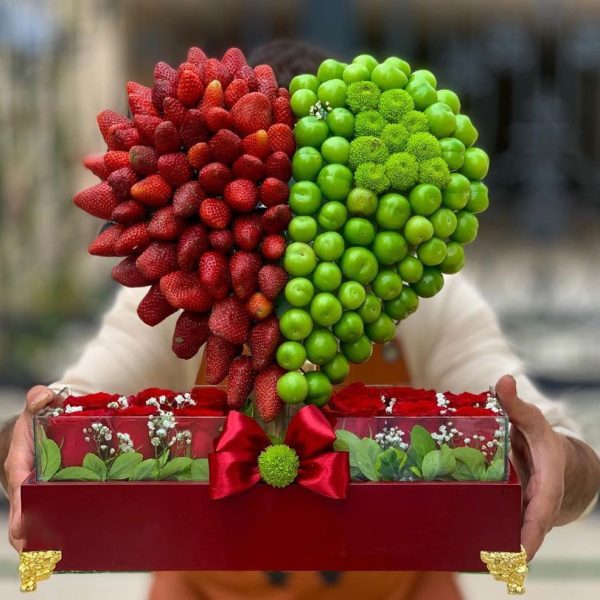 باکس گل نوبرانه love (ترکیب گل رز، گوجه سبز و چغاله بادام)